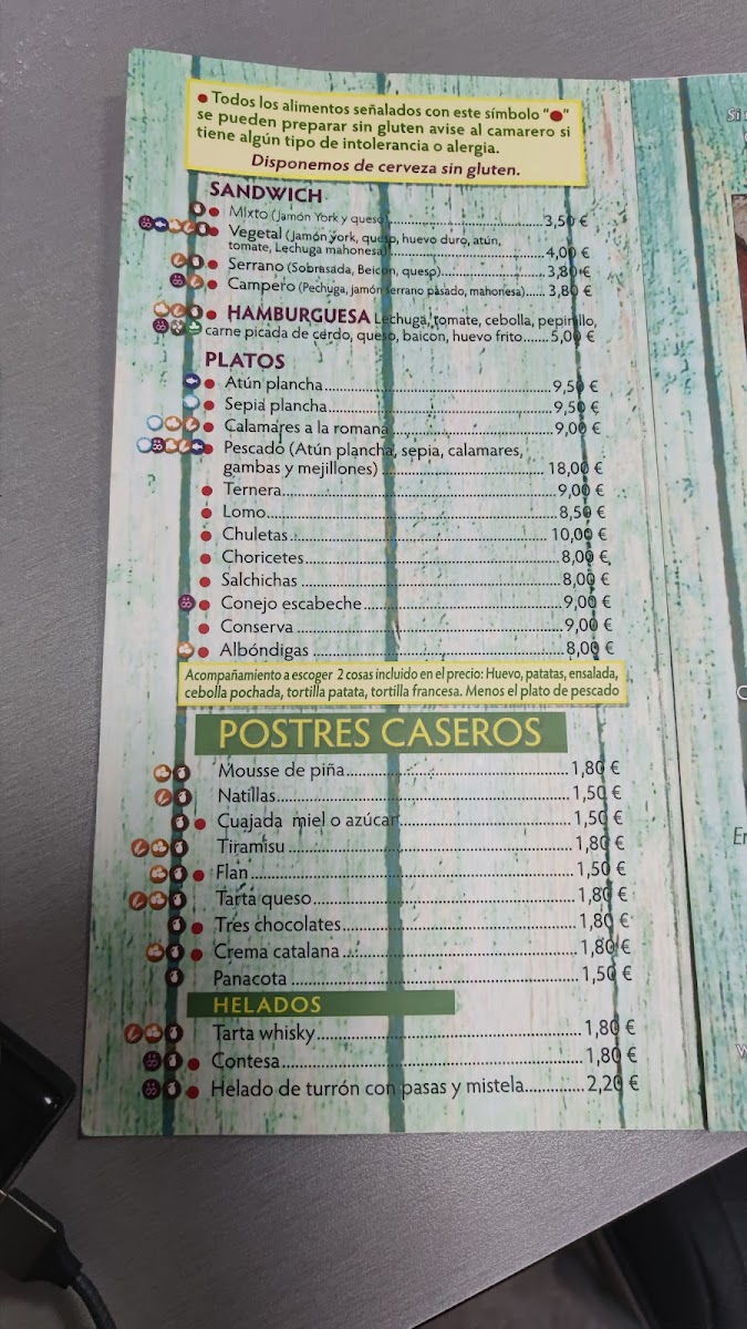 - Desserts: Homemade sweets including tiramisú, crema catalana cuajada con miel (Catalan cream with honey), and dulce de turrón.